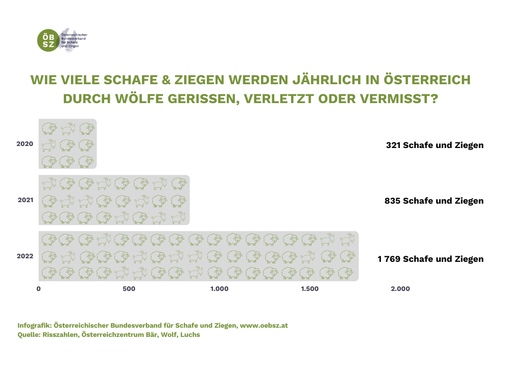 In den letzten Jahren hat sich allerdings eine neue Problematik für die Schaf- und Ziegenlandwirt:innen aufgetan. Die Rückkehr des Wolfes nach Österreich bringt große Herausforderungen mit sich. Die Zahl der gerissenen und verletzten sowie nach einem Wolfsangriff vermissten Tiere steigt kontinuierlich an. Die Fauna-Flora-Habitat-Richtlinie (FFH-RL) der EU stellt das Großraubtier Wolf allerdings unter strengen Schutz. Als Reaktion auf die vermehrten Übergriffe auf Nutztiere haben einzelne Bundesländer Wolfsverordnungen erlassen und ermöglichen so, insbesondere eine Entnahme von Problemtieren.