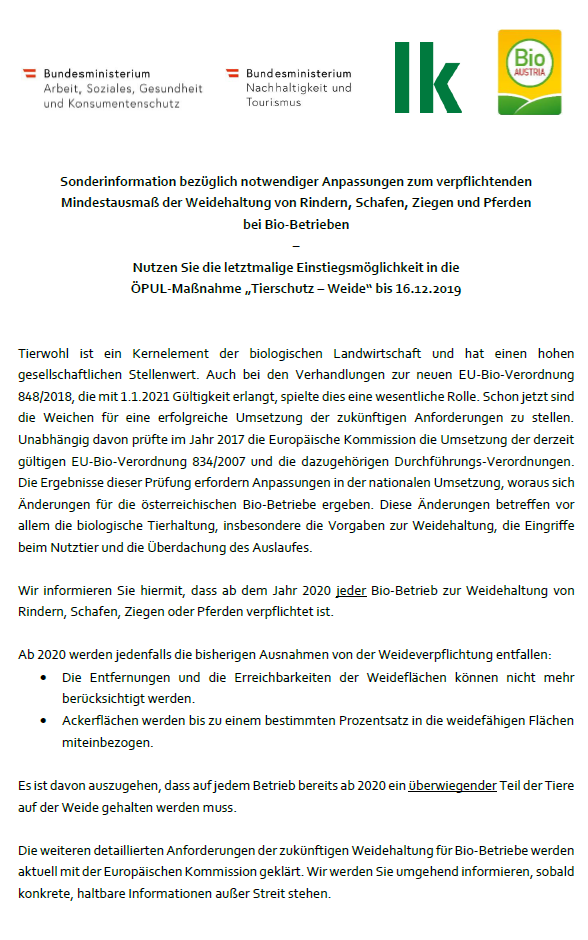 • Sonderinformation: notwendiger Anpassungen zum verpflichtenden Mindestausmaß Weidehaltung