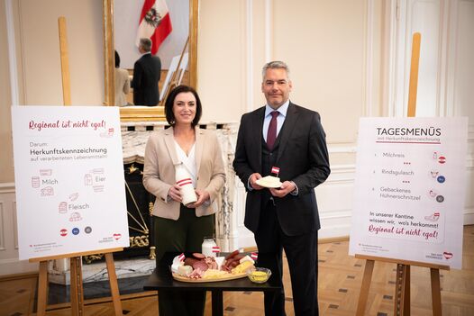 Bundeskanzler Karl Nehammer und Landwirtschaftsministerin Elisabeth Köstinger skizzieren die Eckpunkte der geplanten Maßnahme zur verpflichtenden Herkunftskennzeichnung, die zu mehr Transparenz führen und die regionale Produktion stärken wirdGemeinsam mit Bundeskanzler Karl Nehammer skizzierte Landwirtschaftsministerin Elisabeth Köstinger die Eckpunkte der geplanten Maßnahme zur verpflichtenden Herkunftskennzeichnung. "Seit vielen Jahren fordert die österreichische Landwirtschaft eine verpflichtende Herkunftskennzeichnung. Jetzt gehen wir in die Zielgerade. Noch in diesem Jahr soll die Verordnung erlassen werden, damit wir vollständige Transparenz bei unseren Lebensmitteln ab 2023 haben", sagt Köstinger. Die neue Regelung sieht eine Kennzeichnung der Primärzutaten Fleisch, Milch oder Ei vor, also wenn diese Zutaten zu mindestens einen Anteil von 50 Prozent des Lebensmittels ausmachen oder Konsumenten:innen üblicherweise mit der Bezeichnung des Lebensmittels eine dieser Zutaten assoziieren. Bei Fleisch soll angegeben werden, wo das Tier geboren, gemästet und geschlachtet wurde, bei Milch, wo das Tier gemolken wurde, und bei Eiern, wo sie gelegt wurden. Für die lebensmittelherstellenden Unternehmen bedeutet dies, dass auf der Verpackung die Informationen zum im Lebensmittel verarbeiteten Primärzutaten angeben werden müssen, z.B. bei Wurst, Käse oder Mayonnaise. In der Gemeinschaftsverpflegung z.B. bei Kindergärten oder Krankenhauskantinen, welche von der öffentlichen Hand beauftragt sind, muss die Herkunft mittels Aushang oder Speisekarte ausgewiesen werden.